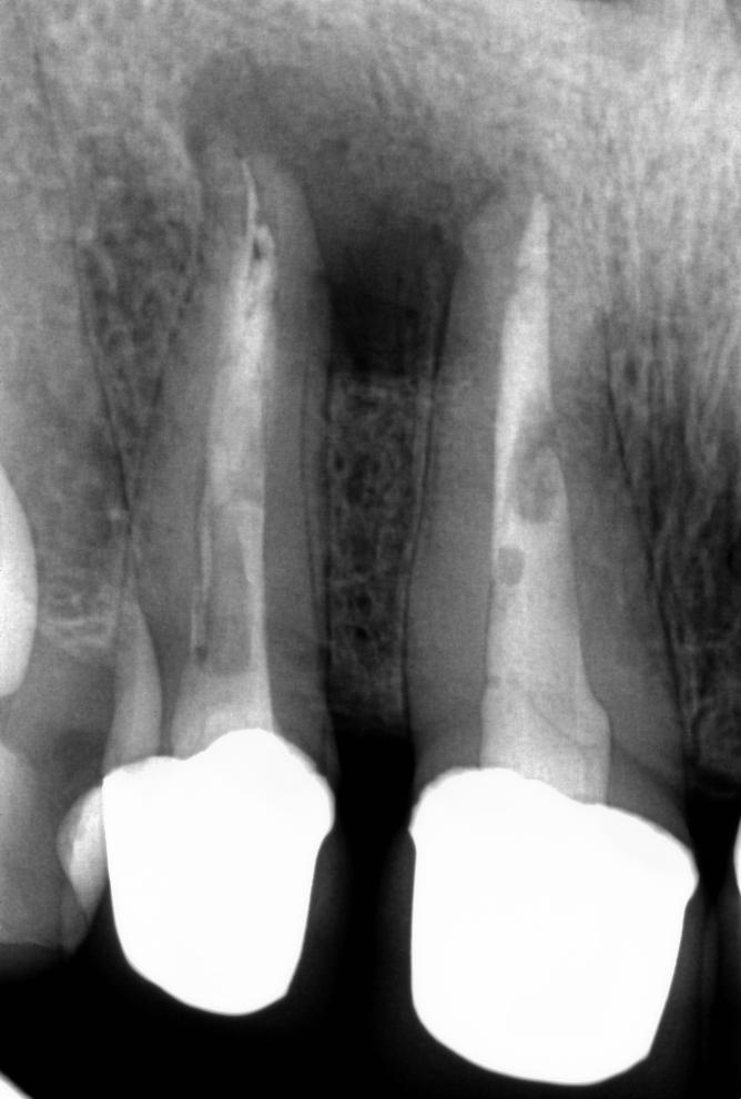 Na zdjęciu RTG widoczna rozległa zmiana okołowierzchołkowa, klinicznie czynna przetoka, świadcząca o przewlekłym stanie zapalnym tkanek otaczających korzeń zęba.