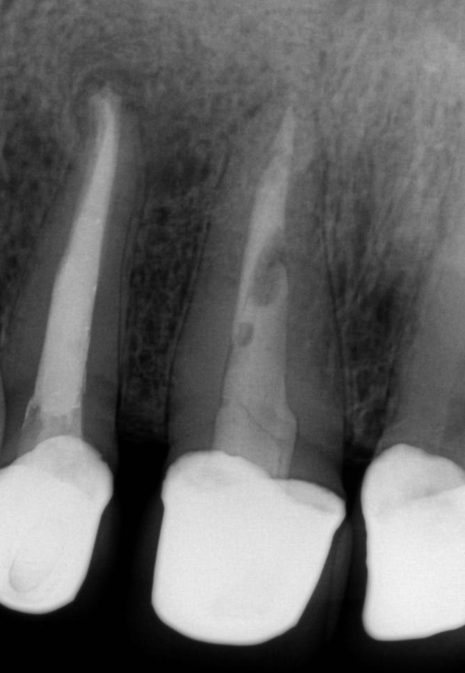 Na kontrolnym zdjęciu RTG widoczna jest regeneracja tkanek okołowierzchołkowych i ustąpienie stanu zapalnego. Ząb został uratowany i może nadal pełnić swoją funkcję w jamie ustnej.